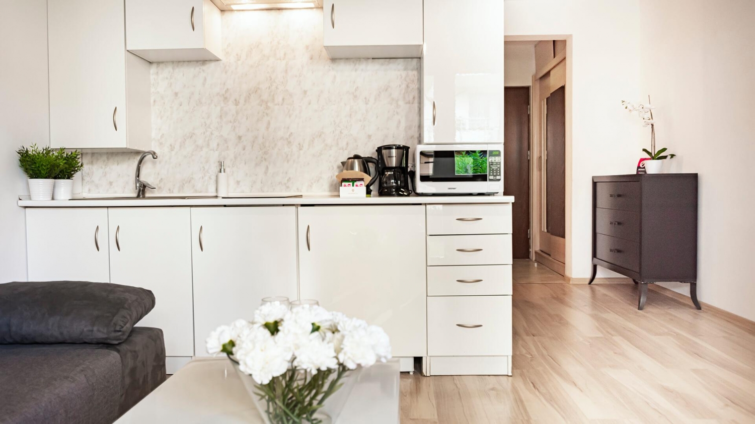 Do dyspozycji Gości pozostawiamy bogato wyposażony aneks kuchenny doskonale przygotowany do wspólnego biesiadowania. Komplet naczyń, sztućce, akcesoria kuchenne, szklanki, kieliszki do wina, kubki i filiżanki wraz z lodówką, płytą grzewczą z okapem i kuchenka mikrofalowa pomogą w samodzielnym przygotowywaniu posiłków wraz z bliskimi.