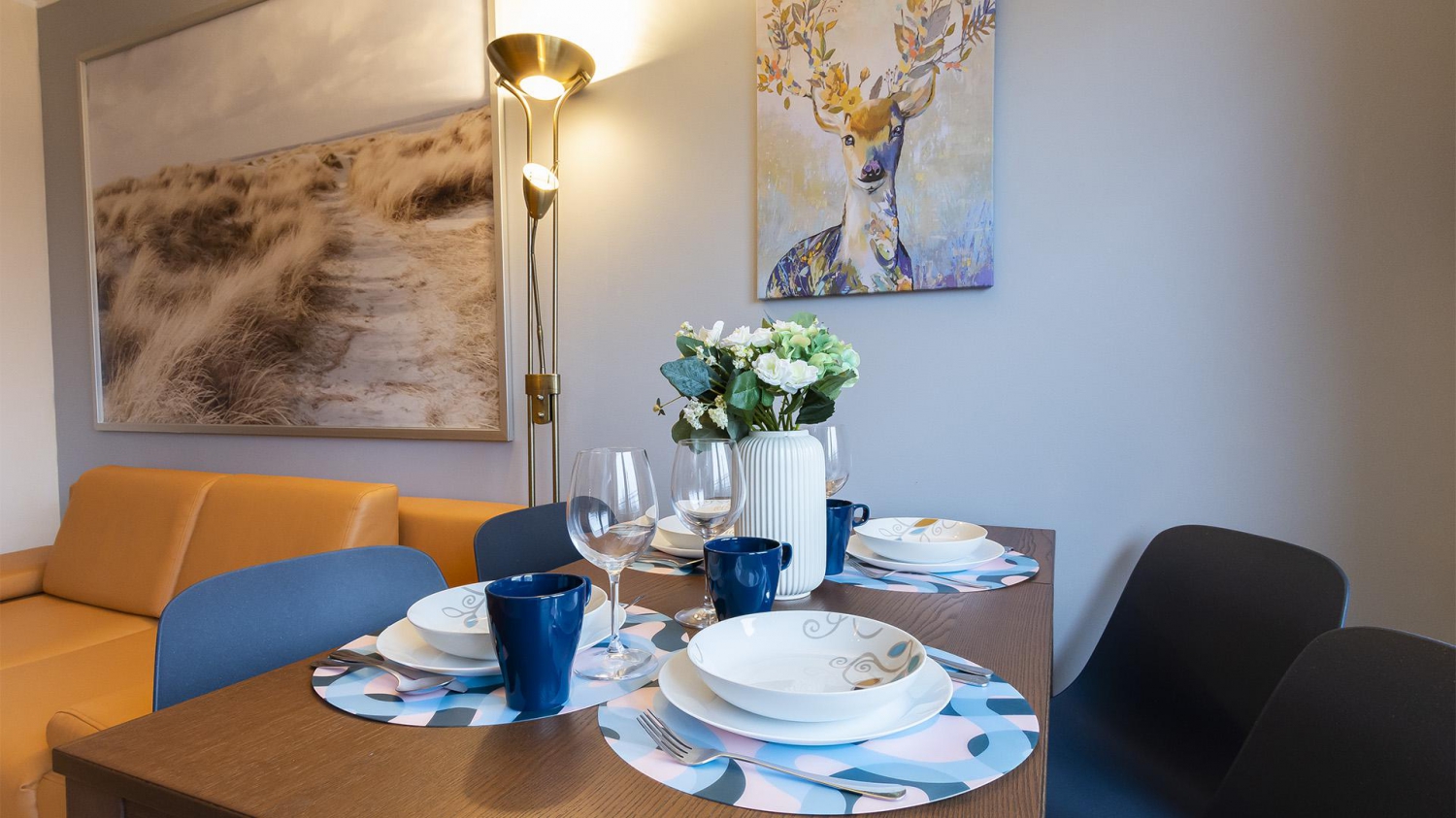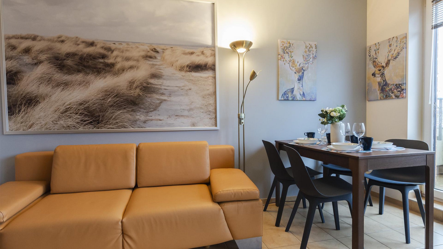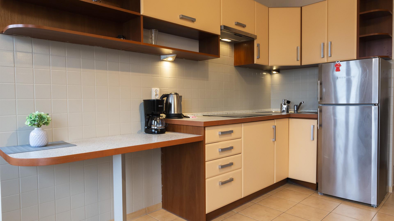W apartamencie znajduje się bogato wyposażony aneks kuchenny przystosowany do zaspokajania codziennych potrzeb. Do dyspozycji naszych Gości udostępniamy nowoczesny sprzęt AGD m.in. lodówkę, płytę, ekspres oraz komplet naczyń, sztućce, akcesoria kuchenne, szklanki i kieliszki do wina. Wszystko, co potrzebne by samodzielnie przygotować posiłki i cieszyć się wspólnymi chwilami z bliskimi.
